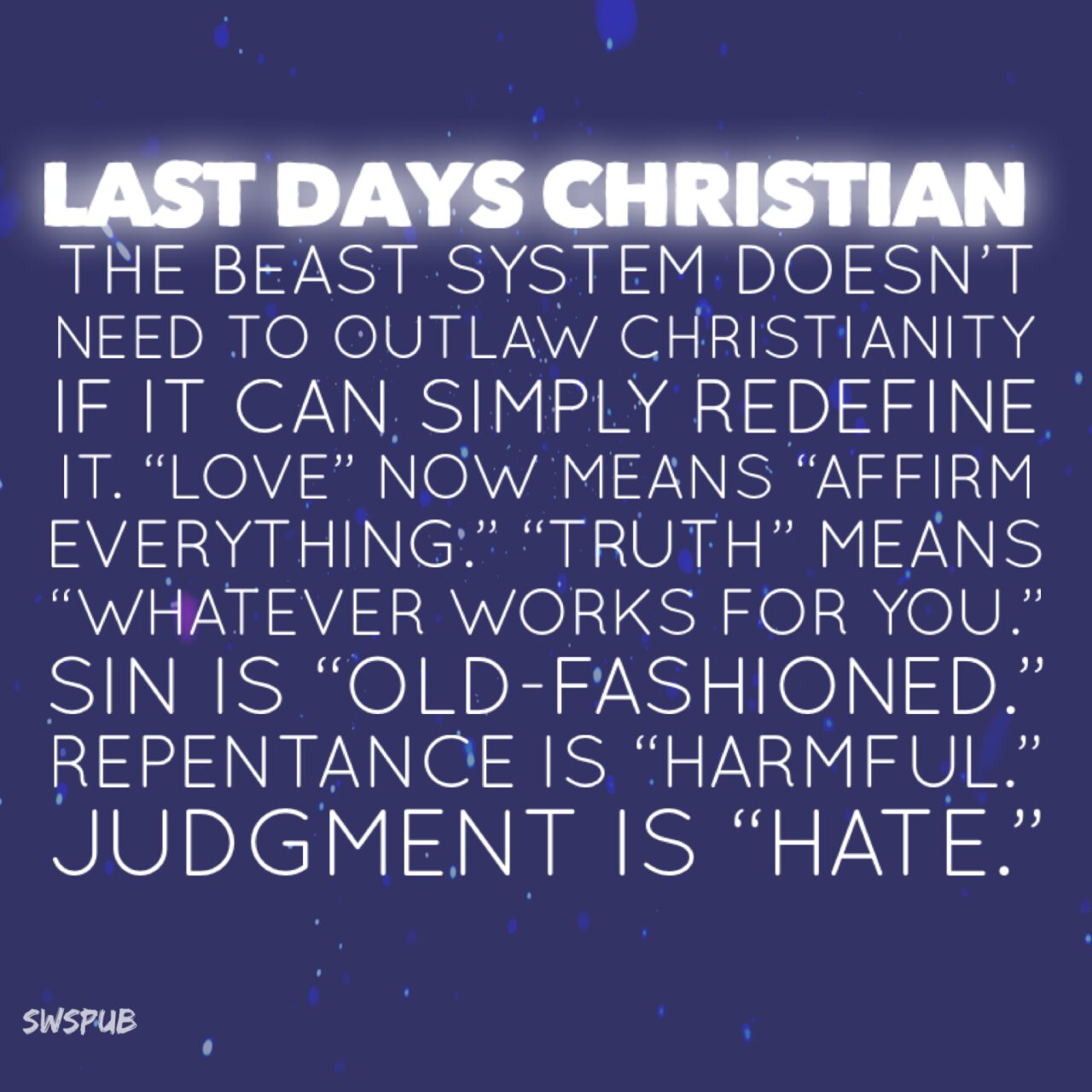 “And every man that hath this hope in him purifieth himself, even as he is pure. 4 Whosoever committeth sin transgresseth also the law: for sin is the transgression of the law. 5 And ye know that he was manifested to take away our sins; and in him is no sin. 6 Whosoever abideth in him sinneth not: whosoever sinneth hath not seen him, neither known him.” 1 John 3:3-6