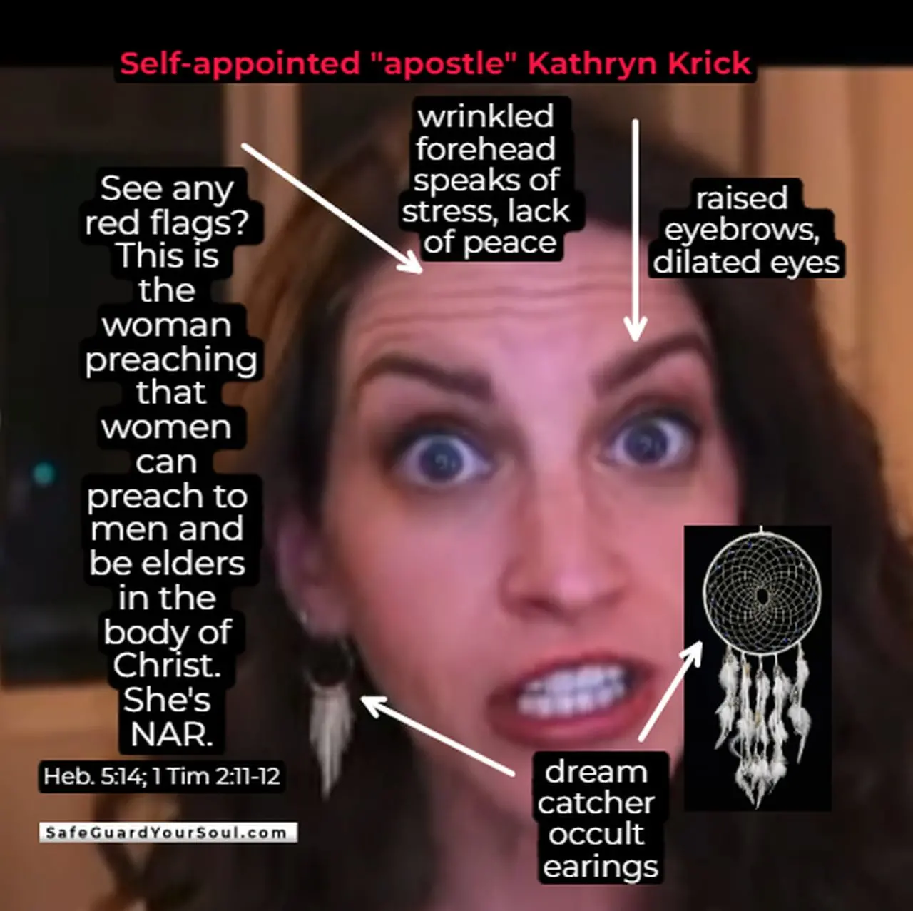 Self-appointed “apostle” Kathryn Krick is part of the apostate NAR (New Apostolic Reformation) Movement which includes false prophets like Bill Johnson, Todd White, and a myriad of other warlocks posing as Christian ministers.