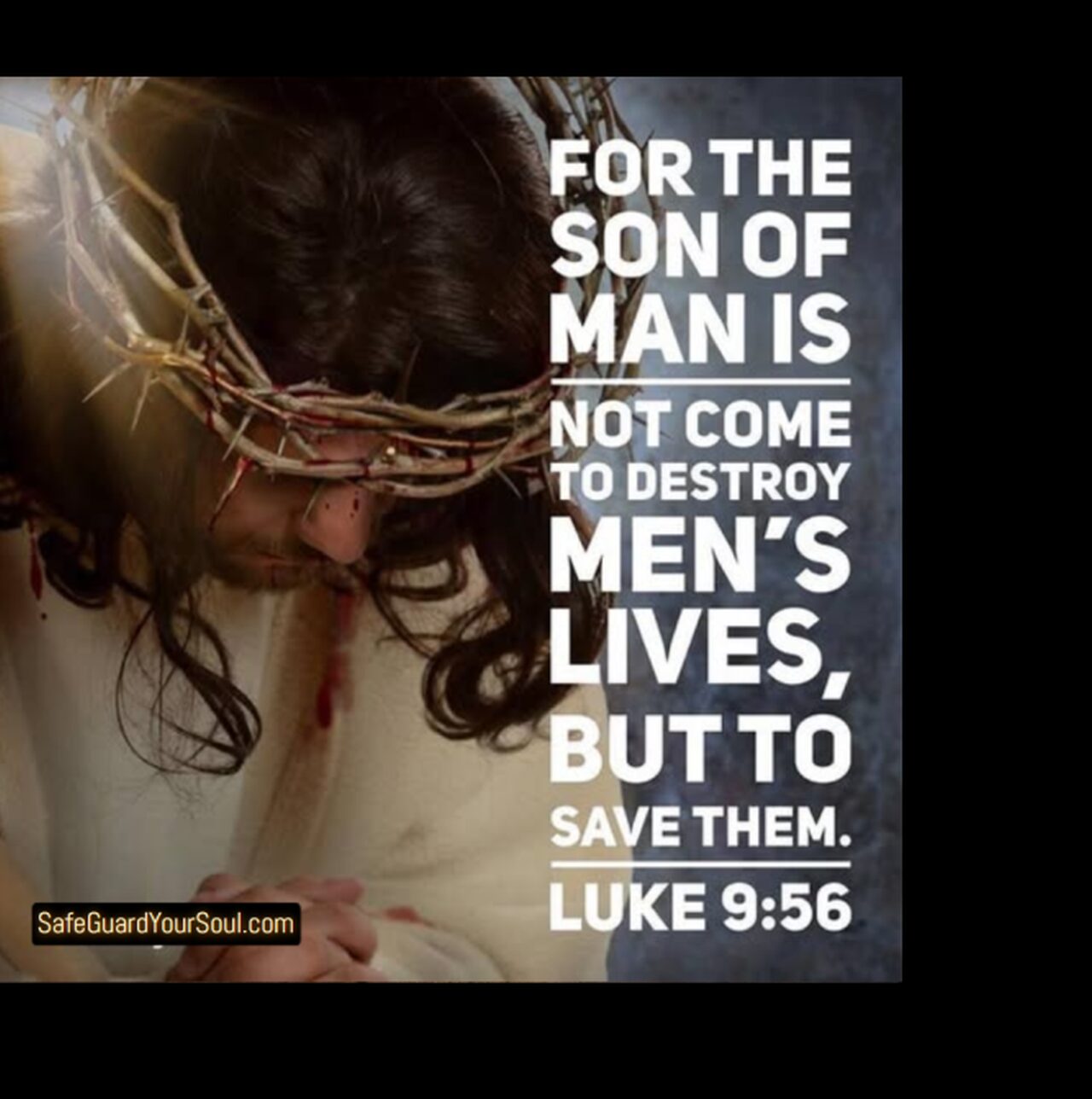 “And it came to pass, when the time was come that he should be received up, he stedfastly set his face to go to Jerusalem, 52 And sent messengers before his face: and they went, and entered into a village of the Samaritans, to make ready for him. 53 And they did not receive him, because his face was as though he would go to Jerusalem. 54 And when his disciples James and John saw this, they said, Lord, wilt thou that we command fire to come down from heaven, and consume them, even as Elias did? 55 But he turned, and rebuked them, and said, Ye know not what manner of spirit ye are of. 56 For the Son of man is not come to destroy men’s lives, but to save them. And they went to another village.” Luke 9:51-56
