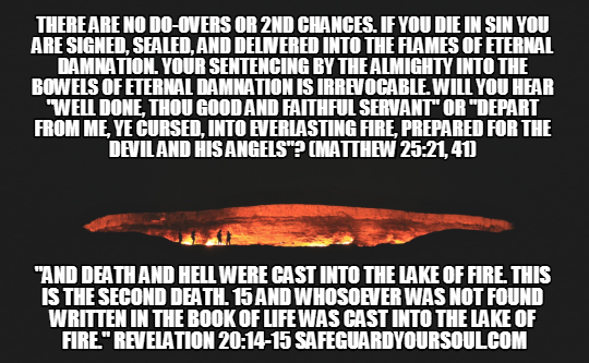 Hell is for keeps. No second chance. Irrevocable … A divine sentence, judgment upon all who die outside of Christ! Sure as you’re breathing, if you are not born again and presently in the middle of God’s will, abiding in Christ on HIS terms, get ready to be consciously, brutally burned world without end.