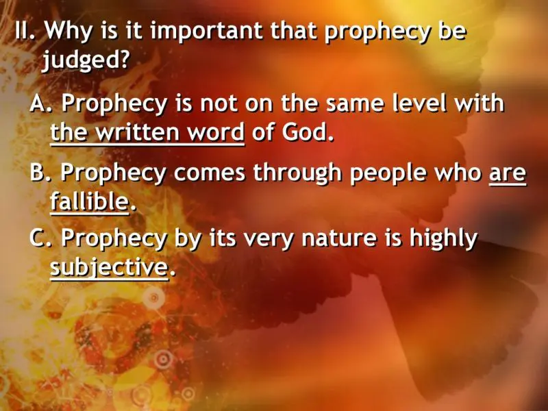 All prophetic words must be “judged” or tested to be proven true or false against the perfect standard – God’s written Word. The written Word of God is called the “MORE sure word of prophecy.” (2 Pet. 1:19) The same Holy Spirit who inspired the written Word will never speak contrary to it (2 Peter 1:20-21).