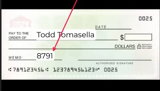 Write … 8791 on blank line at bottom left of check (see graphic below)