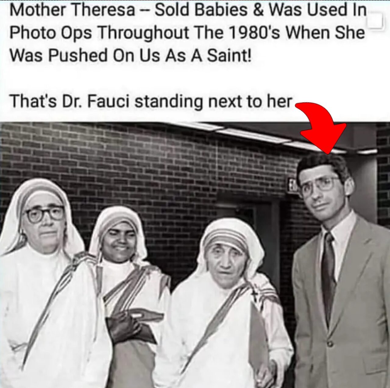 Some believe “Mother Teresa” was actually a man and the father of Anthony Fauci. Check the resemblance, and think about how “she” is never seen without the head covering. Oh and someone pointed out that the blue and white head covering is the same pattern/look as Epstein’s temple to Satan on Epstein island. Do your own research.