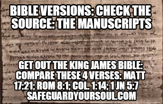 “Many have bought into the New Age Bible version lie. All modern versions come from ‘Satan’s Satanic Verses’/ the Septuagint, Sinaiticus, and Vaticanus—all proven to be blasphemous, counterfeit, and corrupt. These Satanic MSS (manuscripts) come from the underground catacombs of the dead in Roma, Italia (Rome, Italy). Catholics are forbidden to read the Authorized King James Bible, but the modern ‘versions’ are OK! Why? THE NEW VERSIONS ARE CATHOLIC > NEW WORLD ORDER > Antichrist Luciferian Trash Theology.”