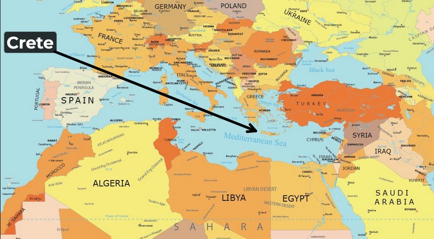 “Though the Old Testament never directly mentions Crete (shown in inset), this island had a significant impact on the history of Israel. Crete was home to the ancient city of Knossos and the great Minoan civilization, the first advanced society in Europe, which flourished from before the time of Abraham until around the time of Moses. As this civilization declined, many people from Crete and mainland Greece began to migrate in vast numbers to new lands further east, including Israel. This is likely how the Philistines came to inhabit the Mediterranean coast of southern Israel. In the centuries that followed, various world powers gained control over Crete until finally it came under the rule of Rome, which grouped it together with the area around Cyrene on the North African coast to form a single province. (Cyrene was the home of a man named Simon, who carried Jesus’ cross for him after Jesus was no longer able to carry it.) As Paul was on his way to stand trial in Rome (Acts 27), he sailed along the southern coast of Crete, and there the captain lost control of the ship in a storm while attempting to reach safe harbor at Phoenix. The sailors became terrified that they would run aground on the sandbars of Syrtis, but instead they were driven by the storm to the island of Malta much further west, and the crew was saved.”