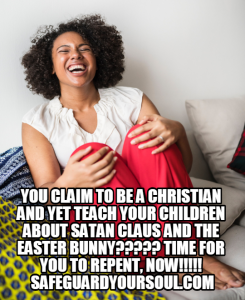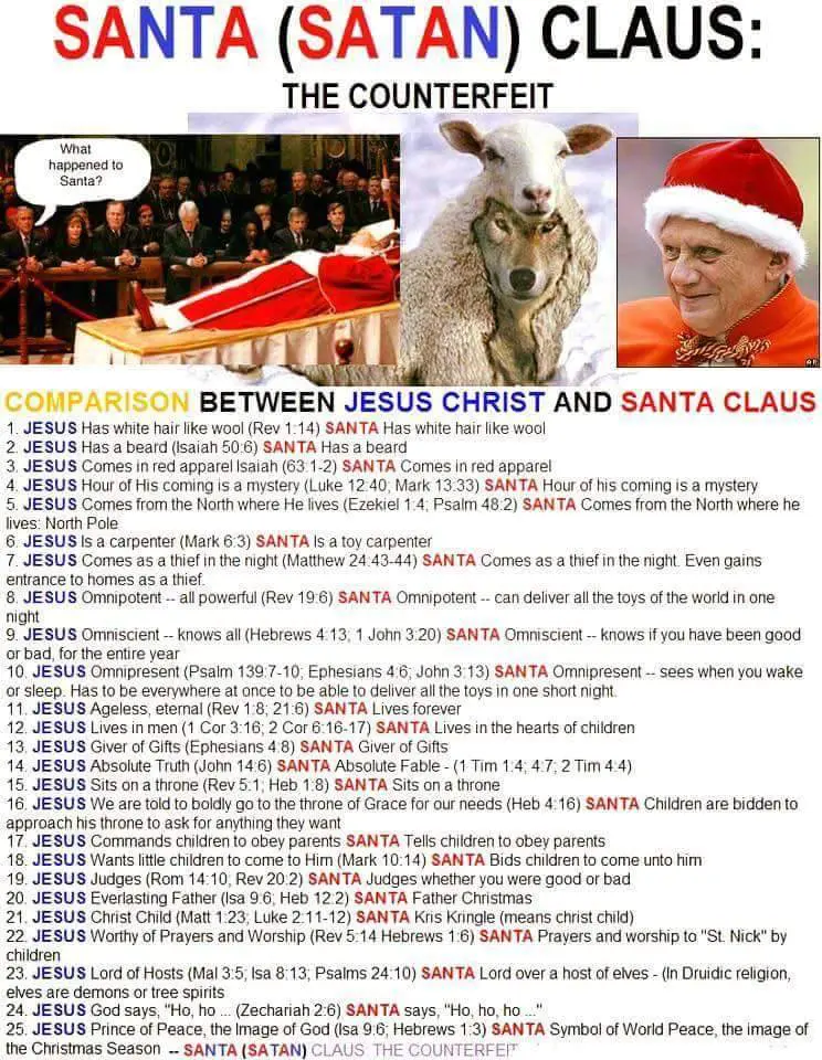 Cassandra Bond Shelton writes: “Santa Claus or Satan’s Claws? Didn’t Jesus say all liars shall have their part in the lake of fire? Thou shall not lie is a commandment! Satan is the father of all lies, right? Antichrist is ‘in place of Christ,’ right? In the past I had taught my older children this Santa Claus lie, and in my search for the biblical gospel I repented of it and turned back to our Savior. My children now know the biblical truth of the meaning of the birth of Jesus Christ and don’t participate in anything to do with Santa Claus. We celebrate the birth of our Lord and Savior Jesus Christ. ‘And ye shall know the truth, and the truth shall make you free… If the Son therefore shall make you free, ye shall be free indeed’ (John 8:32, 36). Amen indeed, and hallelujah! Thank you for sharing the biblical gospel. I saw a meme of a little girl asking Santa, ‘Where are you in the Bible?’ His reply was priceless; he said, ‘The part where I deceive the whole world!’ It was powerful!”